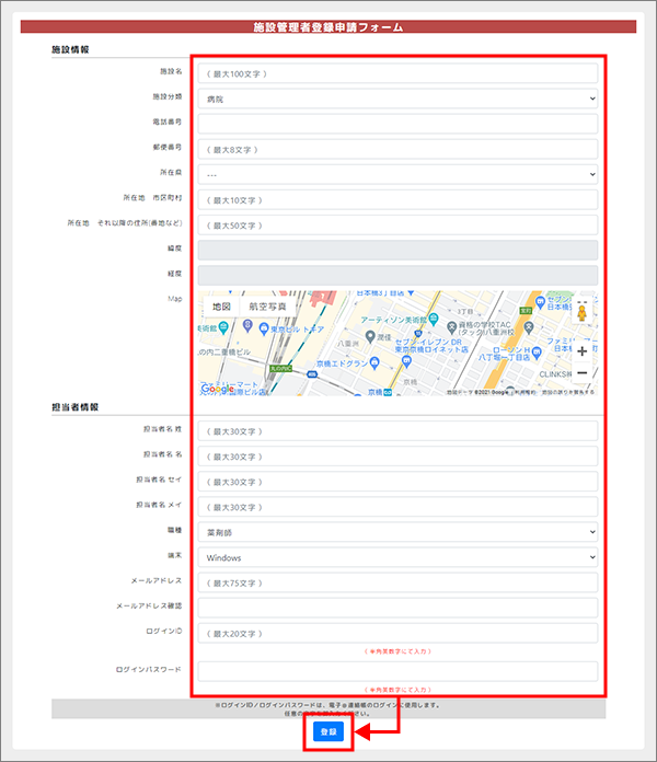 「施設管理者登録申請フォーム」のページが開きますので、情報を入力の上、「登録」ボタンをクリックしてください。