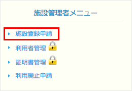 当ポータルサイト、ページ右下の施設管理者メニュー「施設登録申請」より申請を行います。
