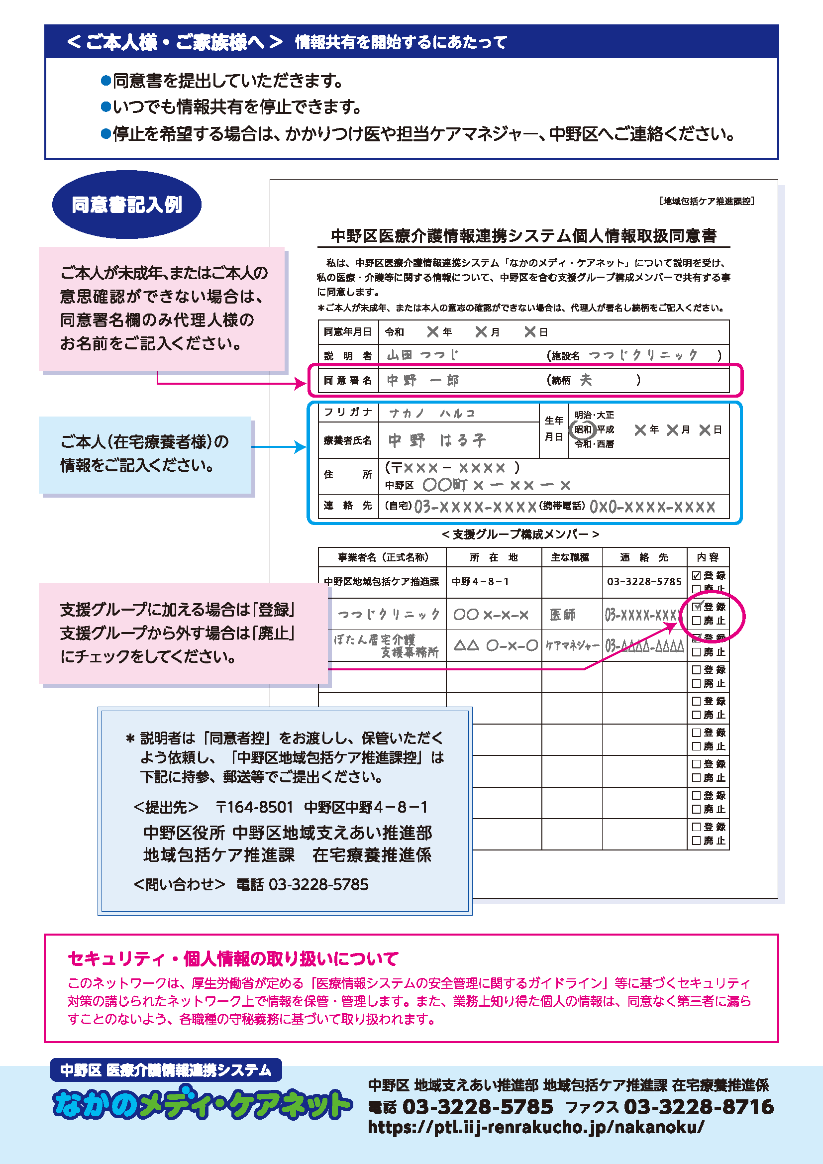 支援グループ代表者は、在宅療養者本人、家族又は家族と同等とみなされる方に「なかのメディ・ケアネット」を利用して情報共有することと、情報共有する事業所について、説明及び確認をしてください。確認後に同意書を取得してください。